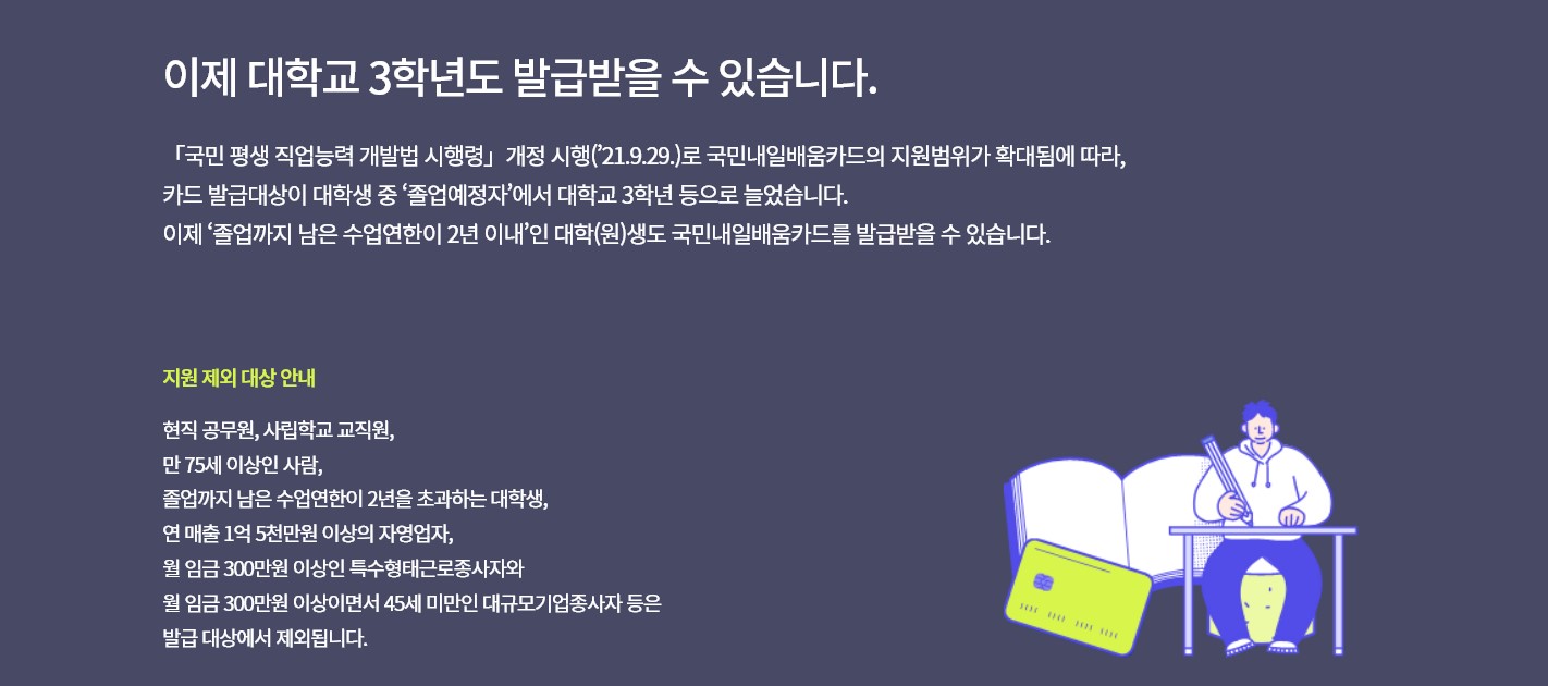 - 참여제한대상 : 공무원, 사립학교 교직원, 졸업예정자 이외 재학생, 연매출 1억5천만원 이상의 자영업자, 월 임금 300만원 이상의 대기업근로자(45세미만)